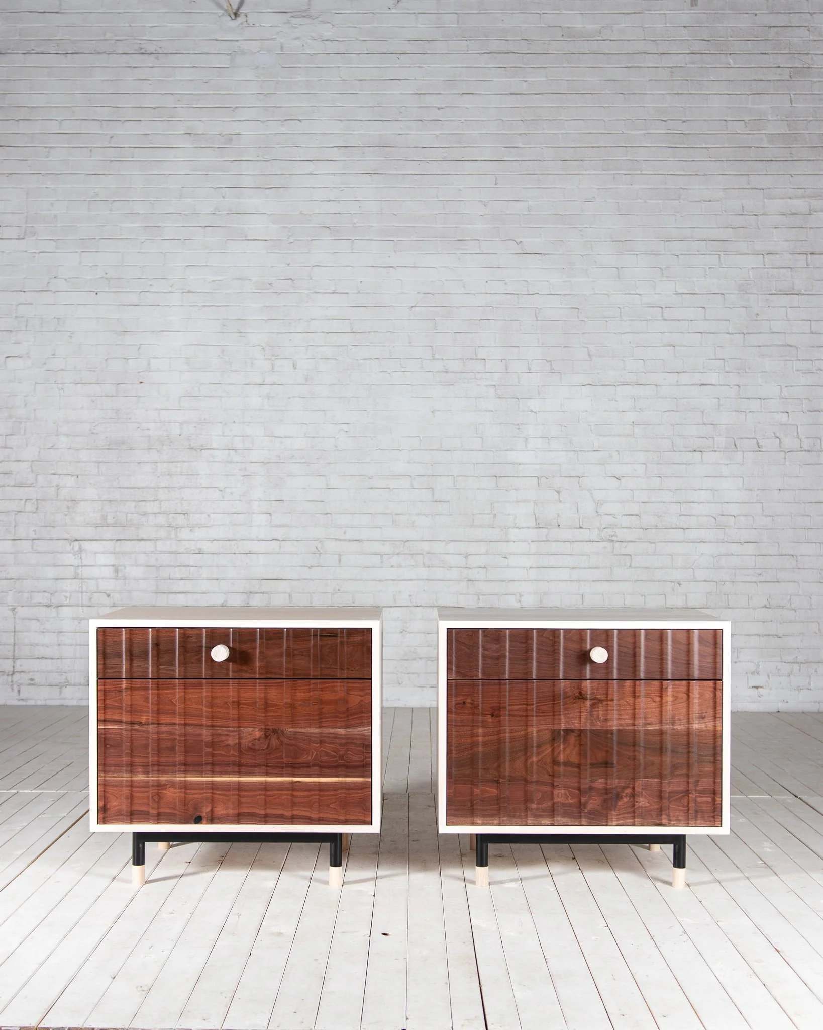 This piece comes standard with a single 6” top drawer with a door to access the lower storage space, but can be configured with all drawers or no drawers upon request.